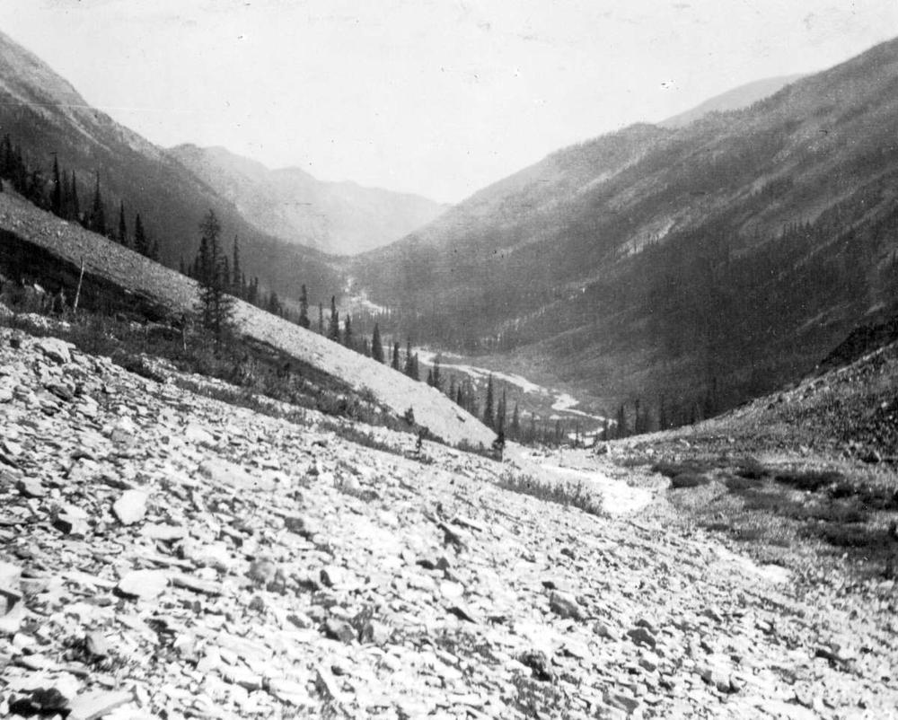 Nonetheless, as early as 1898 the creek is referred to in mining reports as “Law’s Creek”, quickly shortened to Law Creek.17 A great deal of attention was given to the headwaters of Law Creek in 1898/1899 with the Pretty Girl claim, which extended over into the Law Creek valley from the head of Boulder Creek (Bruce Creek). The Silver Thread claim also gained attention, and was notable for its high altitude and location far back in the basin through miles of heavy timber.18 A rawhide trail (a graded track used for hauling out ore in hides pulled by horses) was put in up the creek in 1899 to give better access to various claims.19 As far as I know, there isn’t any trail leading up into the area anymore, although if anyone wants to go exploring please take photos to share!