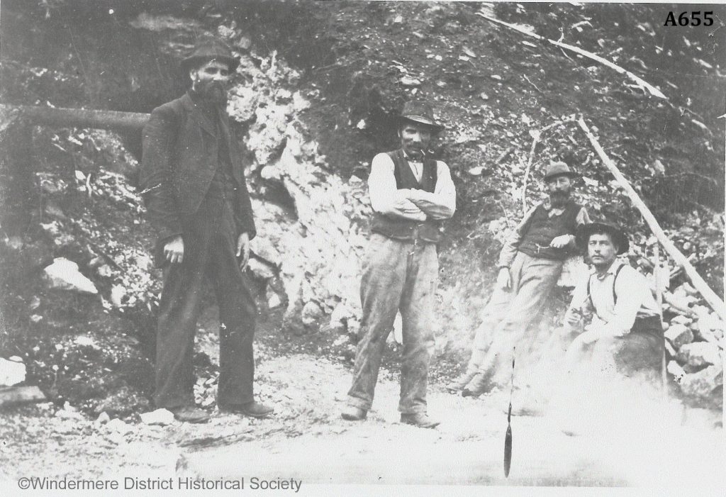 The mouth of the tunnel at Mineral King, early 1900s. Identification of the people is sketchy: William Taynton is sitting, and it is likely that the one on the left with the fabulous beard is Ben Abel. The other two are identified in museum records as Mr Carter (leaning), and Joe Erickson (standing), although I have no record of either of these people being involved with the claim. “First work done on Mineral King Mine,” n.d., a655, Windermere Valley Museum and Archives.