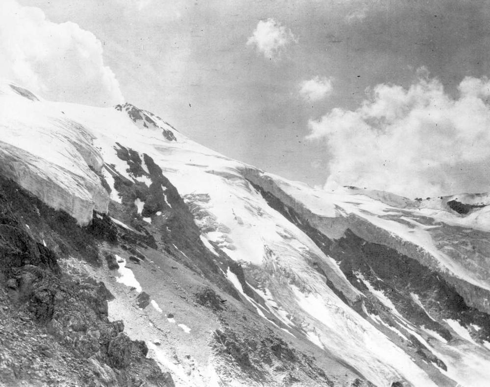 Iron Cap Creek was a tributary to McDonald Creek, and may have been another name for Red Line Creek. None of these glaciers remain. British Columbia, Dept. of Mines album 1915, “Panorama glacier, head of Iron Cap basin,” 1915, I-62668, BC Archives.