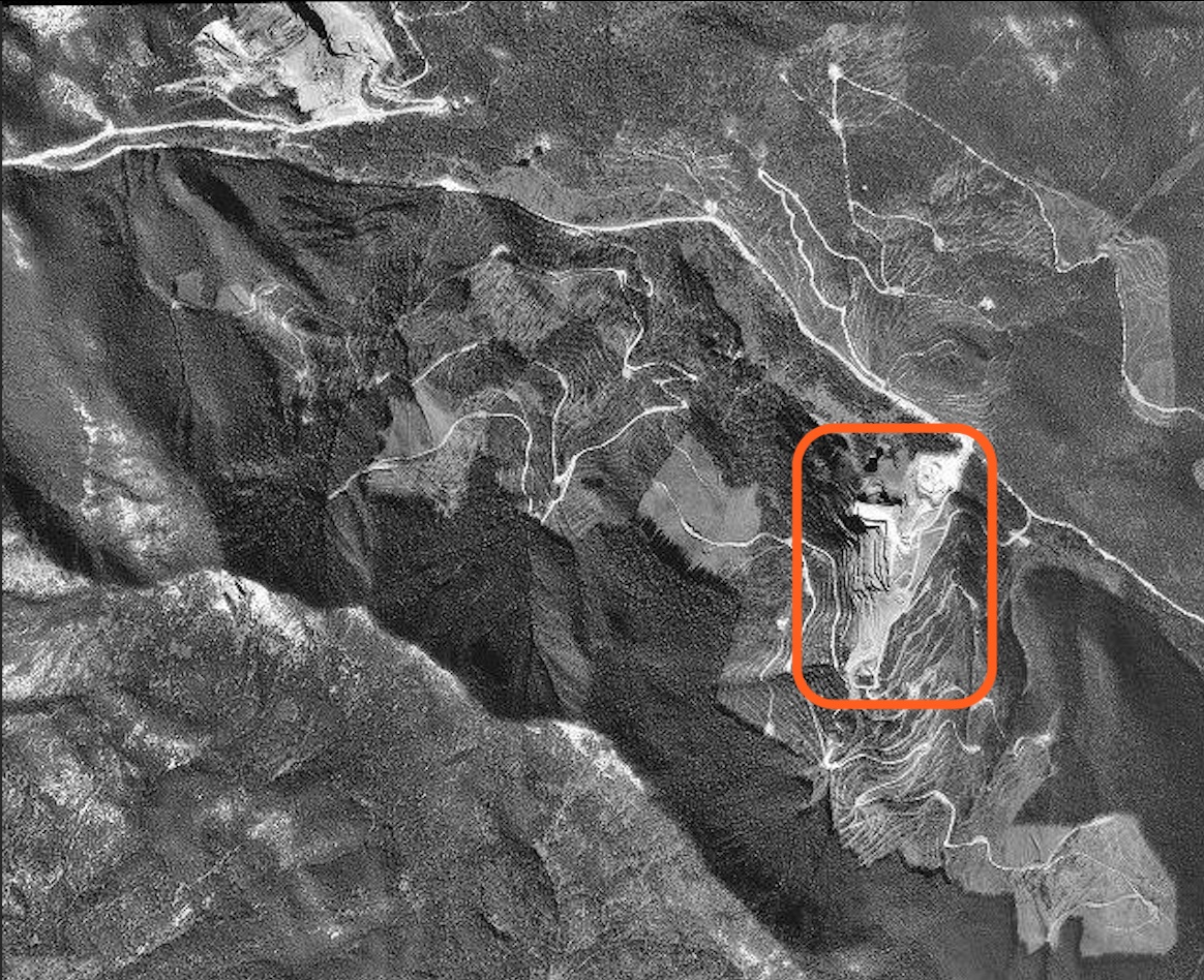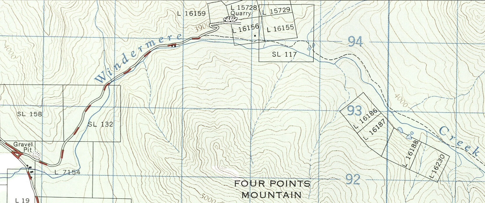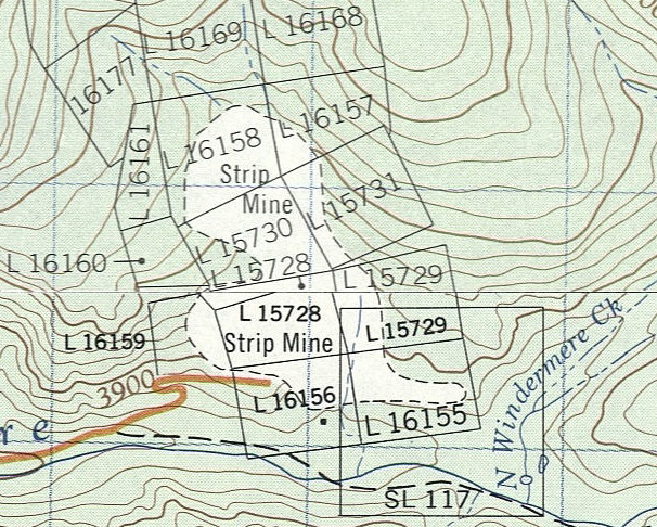 The new (slightly higher) No. 1 Quarry was located at an elevation of 4,000 feet (1,200 meters) on a steep, southwest slope on the hillside north of Windermere Creek.49 The earliest topographic map of this area (1966), based on data compiled between 1953 and 1962, shows the quarry at the intersection of the Blue Goose, Blue Hawk, and Blue Jay claims.