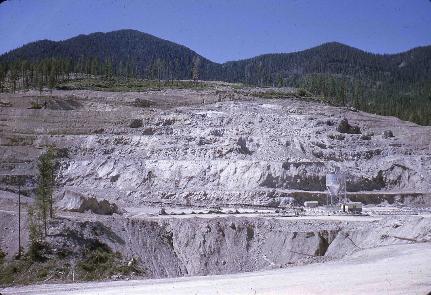 Production at the mine remained intermittent until September 1950 after which more regular shipments were made.35 This delay in production was in part due to having to shift the quarry slightly further up the hill after irregular masses of clay were found scattered through the gypsum at the original workings (see section “Quarries” below).36 Until early 1954, on-the-ground operations were under resident manager John M. Cummings, who was formerly a specialist in industrial minerals with the BC Department of Mines.37