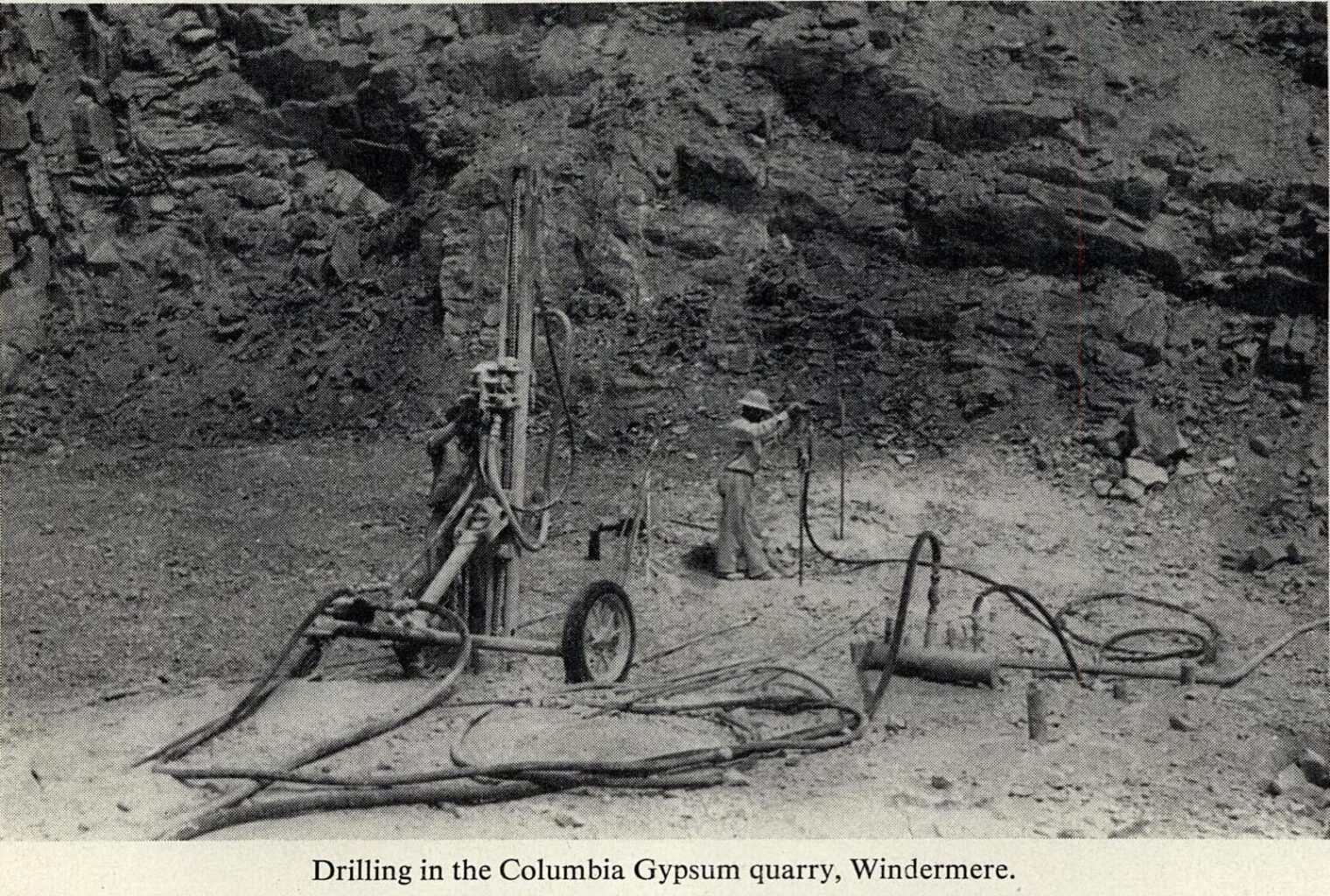 The first quarry got off to a rocky start. Work began there in spring 1950 and irregular shipments were made, but that summer masses of clay found scattered through the gypsum caused quality control problems. That layer of gypsum was abandoned and operations were moved to higher grade material located slightly further up the hill.47 Photos of early workings in the No. 1 Quarry, before operations were moved upwards, show drilling on a very steep face and what looks to be an entrance to some kind of underground workings. No written description of the latter has been found, although I have heard one account of work underground.48
