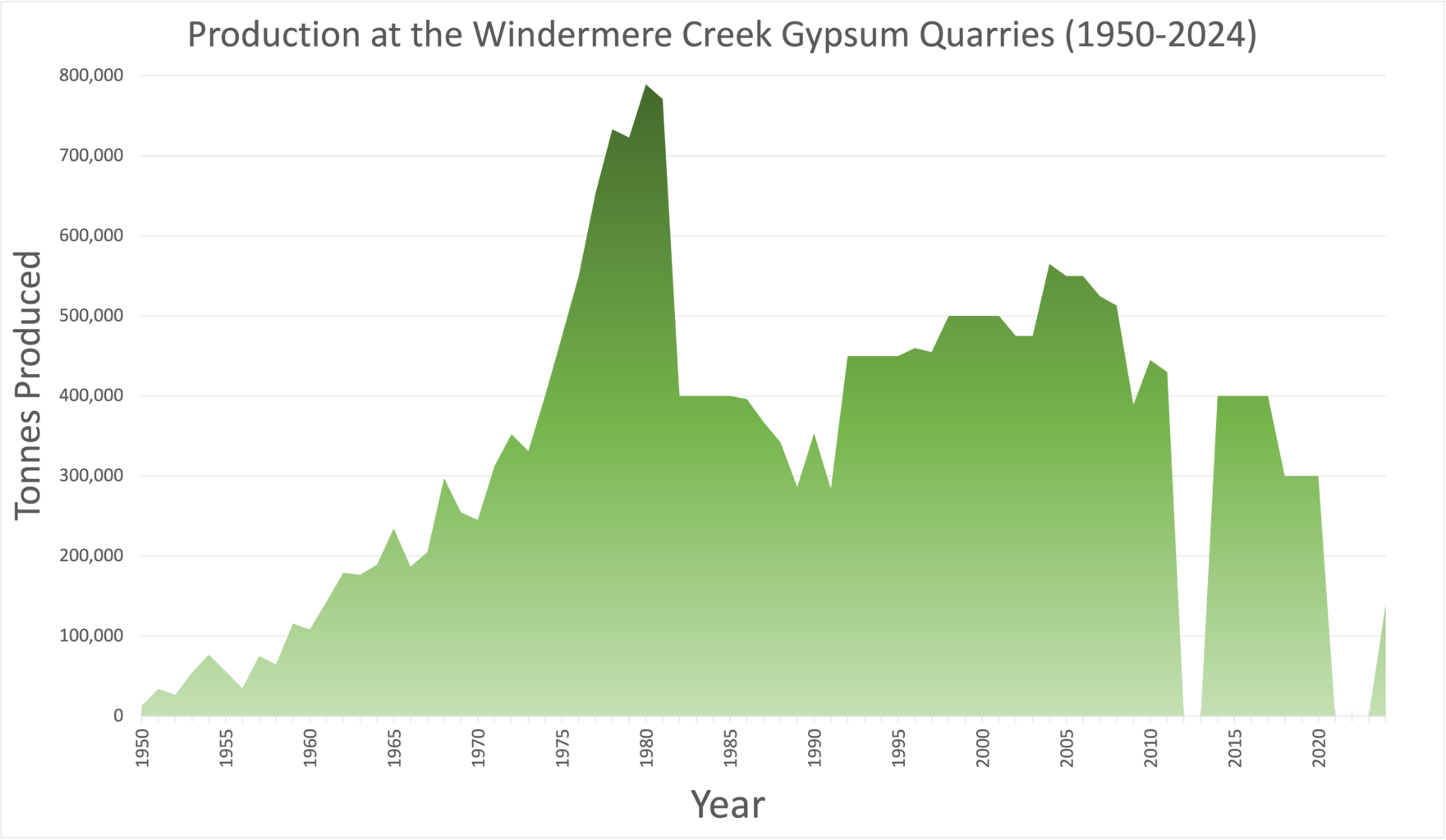 The height of production at the Windermere gypsum mine, fueled by strong building demand and shortages of drywall, was in 1980 when nearly 800,000 tonnes were produced.45 That year a new gypsum mine on the west coast of Mexico, combined with very low shipping rates and a downturn in the housing market, saw a depression in the gypsum market that lasted over a decade.46 For several decades now, since about 1990, the amount of gypsum produced from the quarries has stayed relatively steady at between 400,000 and 500,000 tonnes per year.