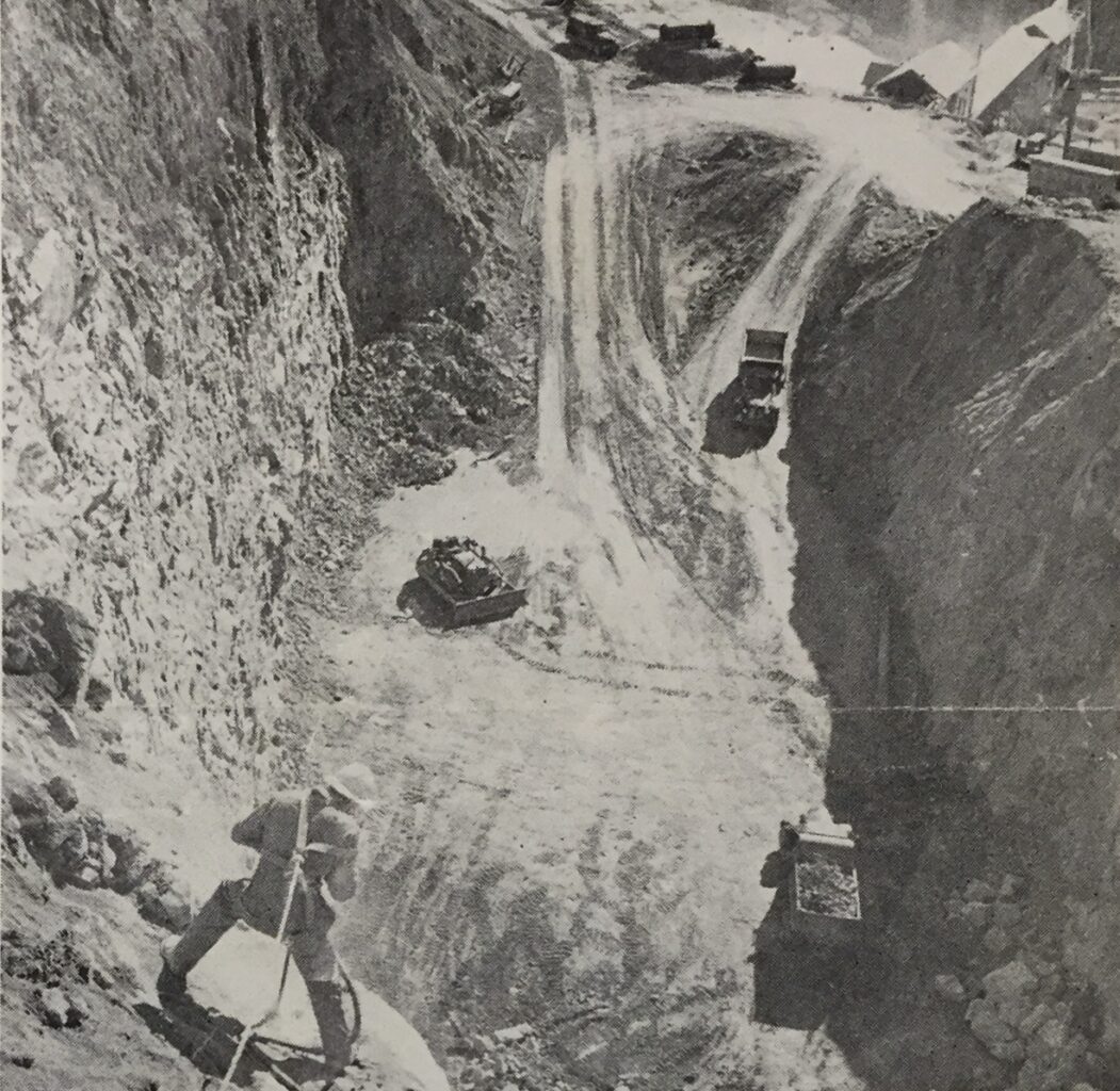 There was some variation to this method. The early quarry was incredibly steep, with workers rappelling on ropes down the face to drill into the rock. In 1958, shortly after the mine was sold to Western Gypsum Products Ltd (in 1957), a new quarry was opened and gypsum began to be blasted out in wider “benches”. While the face of the quarries was still steep, it wasn’t nearly as high, and didn’t require the high-rope acrobatic drilling from earlier years!