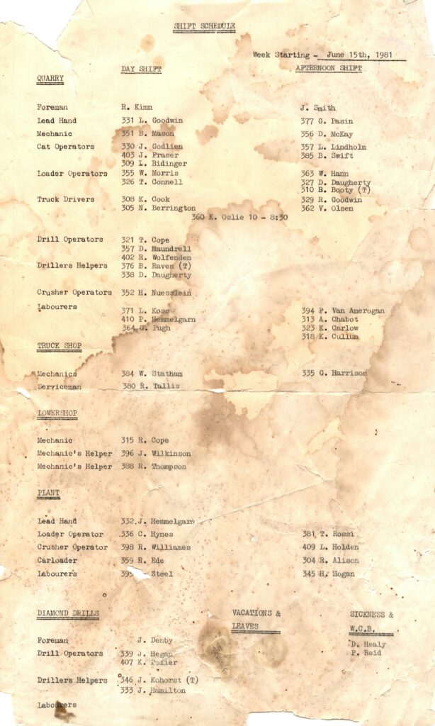 Operations through the years have regularly employed between 10 and 30 people: in some years the quarry has only operated for part of the year. Aside from seasonal and operational variations, employment was remarkably steady: working at the mine was a well-paid job, and Jerry Kohorst, who worked at the mine between 1977 and 2015, recalls that very few people quit.38 If you’re interested, you may find some familiar names on a shift schedule from June 1981 below: thanks to Jerry Kohorst for sharing this!